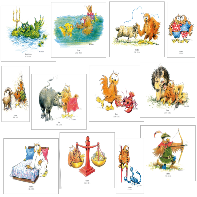 Alle 12 Tierkreiszeichen als Minikärtchen mit seidengefütterten Hüllen
